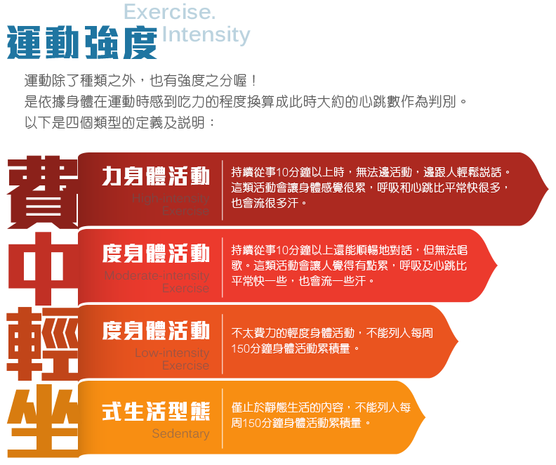 l 高強度運動(High-intensity Exercise):感到非常吃力,喘到無法說話,呼吸、心跳速率都明顯㽪加,且大量流汗